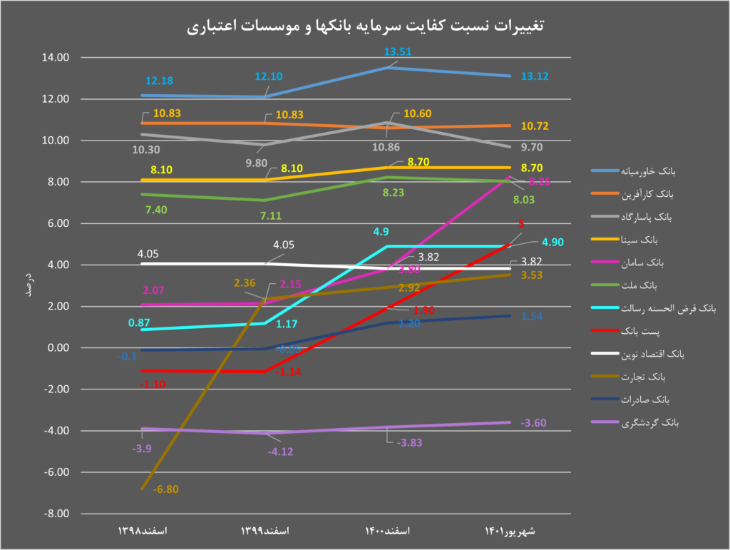 البته بانکهای قرض الحسنه رسالت، پست بانک، تجارت و صادرات طی سالهای اخیر نسبت کفایت سرمایه خود را بهبود بخشیدند. این نرخ برای بانک رسالت در پایان سال 98 کمتر از یک درصد بود که بر اساس آخرین نرخ اعلامی این نسبت به 4,9 درصد ارتقا یافته است. بانک تجارت که در پایان سال 98 نرخ کفایت سرمایه منفی 6،8 درصد داشت اکنون به نسبت کفایت سرمایه 3،53 درصد دست یافته است. بانک صادرات نیز در پایان سال 1399 نسبت کفایت سرمایه منفی 5 صدم درصدی داشت که در سال جاری موفق شد این نسبت را به 1،54 درصد بهبود بخشد.