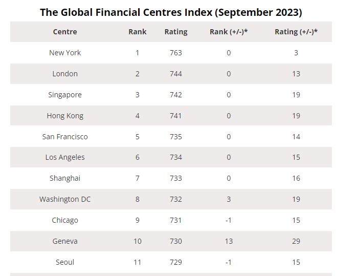 لندن در مقایسه با رتبهبندی سال گذشته و رتبه دوم جهانی، اندکی به نیویورک نزدیک شده، اما تنها از سنگاپور و هنگ کنگ به ترتیب در مکانهای سوم و چهارم جلوتر است.