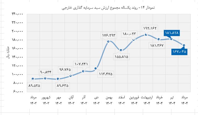 اما ارزش سبد سرمایه گذاری خارجی در بازار سرمایه ایران در پایان مردادماه نسبت به پایان تیرماه کاهشی ۱.۴ همتی را تجربه کرد که نشان دهنده کاهش ۸.۱ درصدی طی این مدت است؛ به طوریکه ارزش سبد سرمایه گذاران خارجی در بخش سهامداران حقوقی در تیرماه ۱۶.۷ همت و ارزش سهامداران حقیقی ۱.۴ همت بود که نسبت به ماه قبل خود (خردادماه ۱۴۰۴) تغییری نداشت.